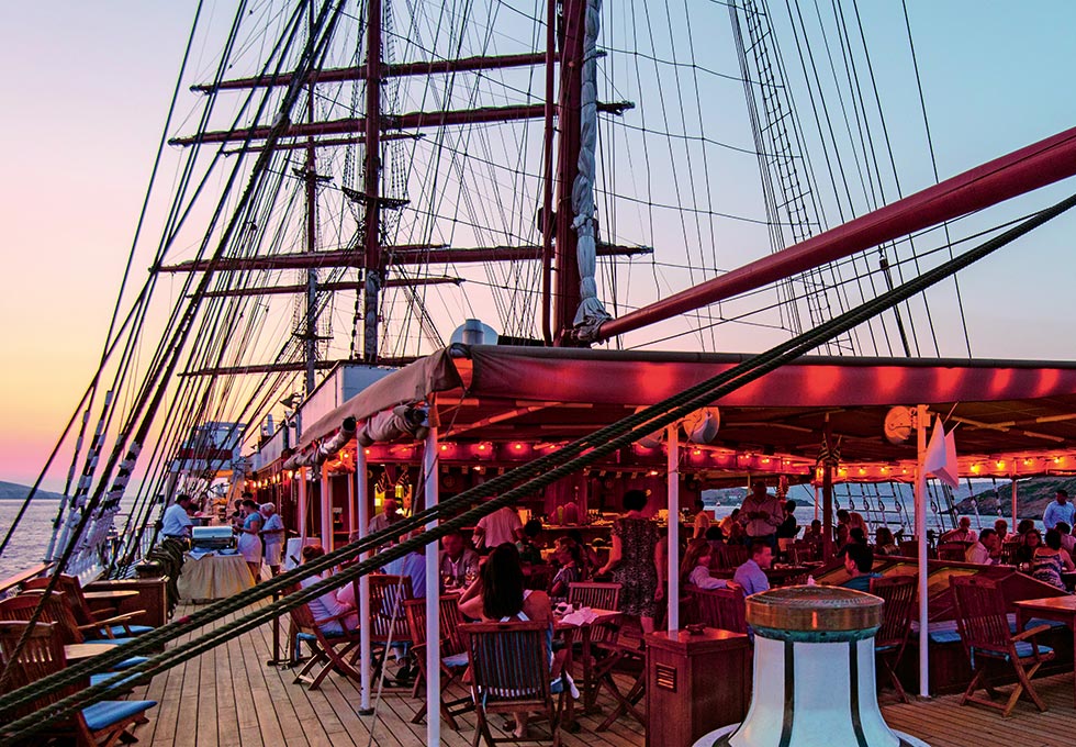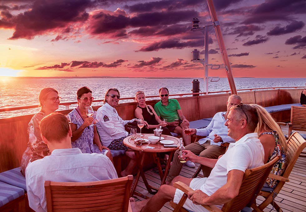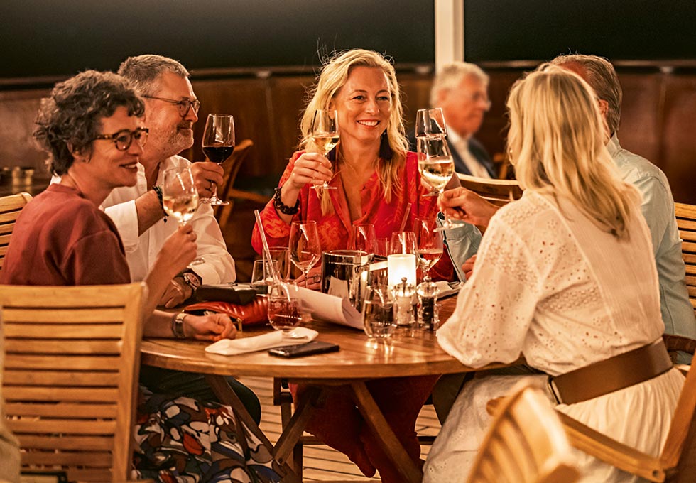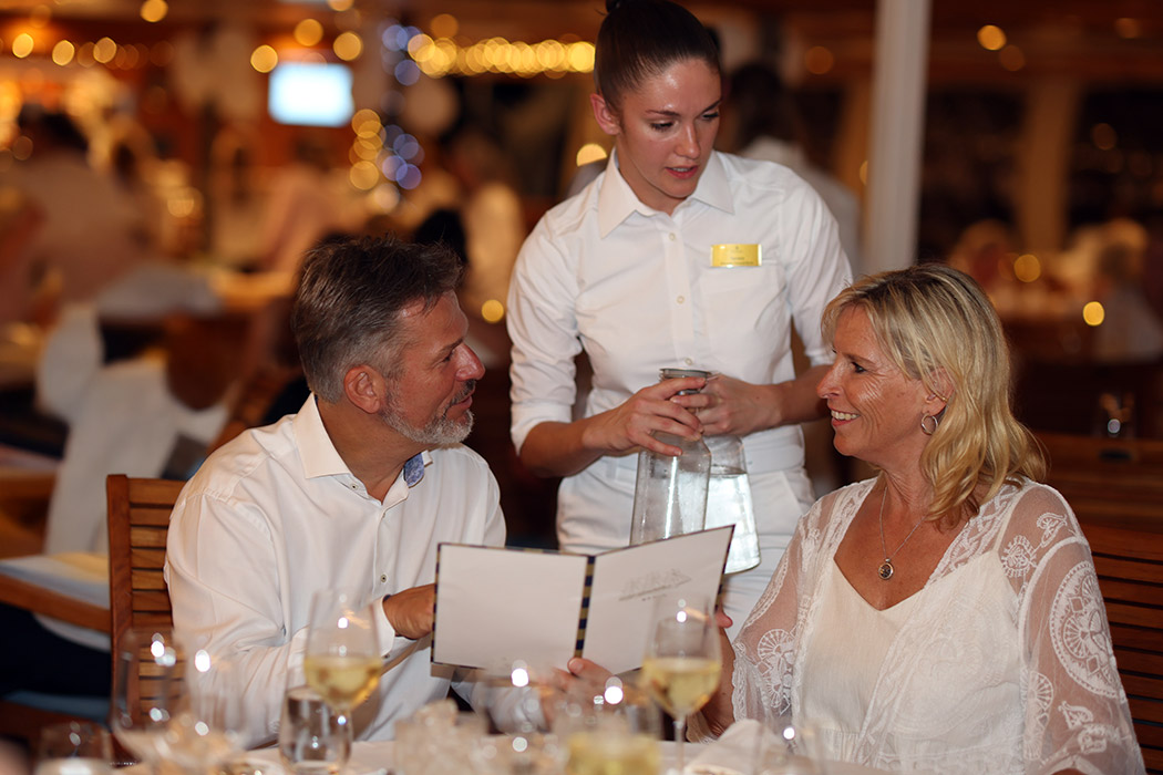 Am Abend ein Cocktail auf dem Sonnendeck, danach das Captainʼs Dinner im Restaurant mit Panoramablick – der perfekte Start in Ihre Reise unter Segeln.