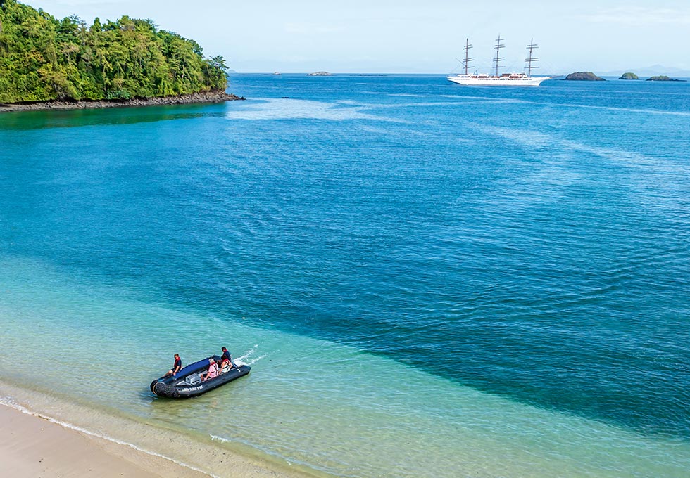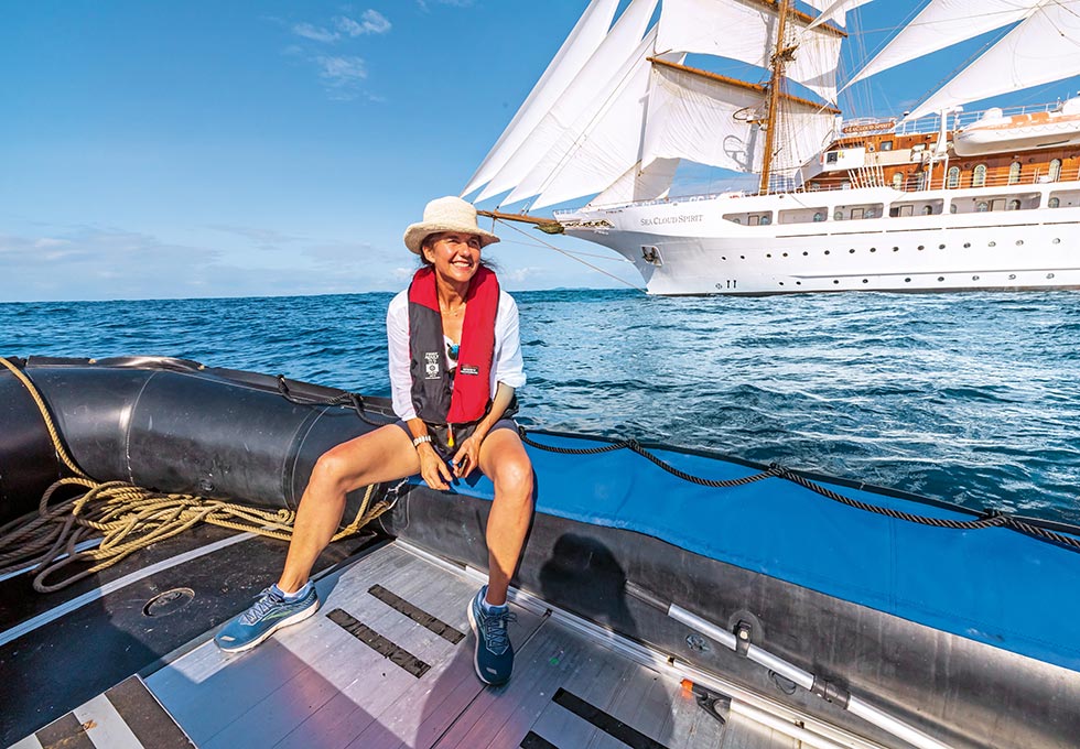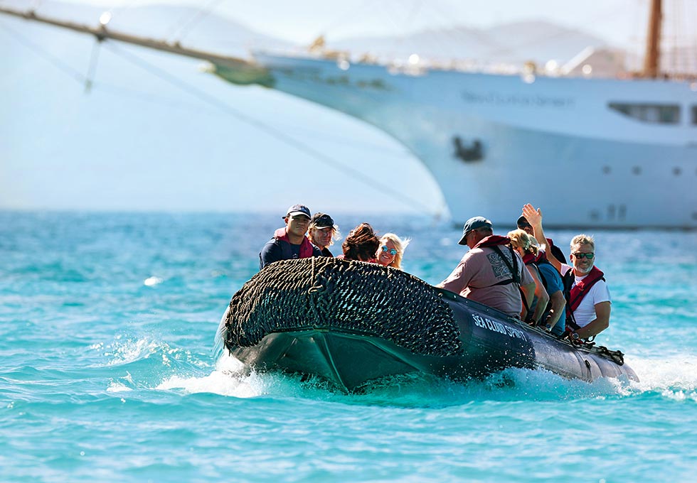 Wo die großen Kreuzfahrer wenden müssen, segeln wir mitten hinein in Buchten und kennen hier jeden Geheim-Spot. Der nächste Traumstrand liegt oft nur eine Spritztour mit dem Zodiac entfernt. Die SEA CLOUDs kennen hier jeden Geheim-Spot – und der nächste Traumstrand liegt oft nur eine Spritztour mit dem Zodiac entfernt. Vor dem Beach-Barbecue gehört der Moment ganz der karibischen Leichtigkeit, mit den Füßen im Wasser und einem Cocktail in der Hand.