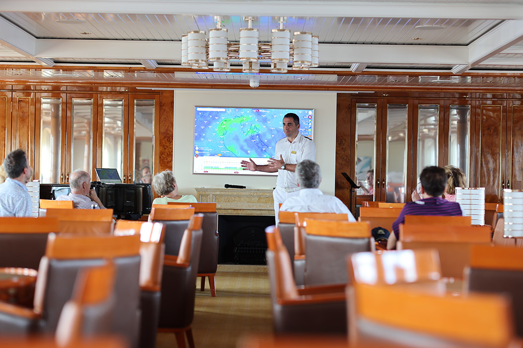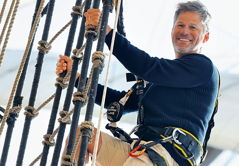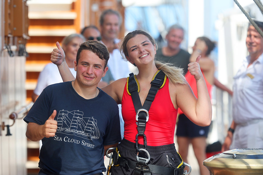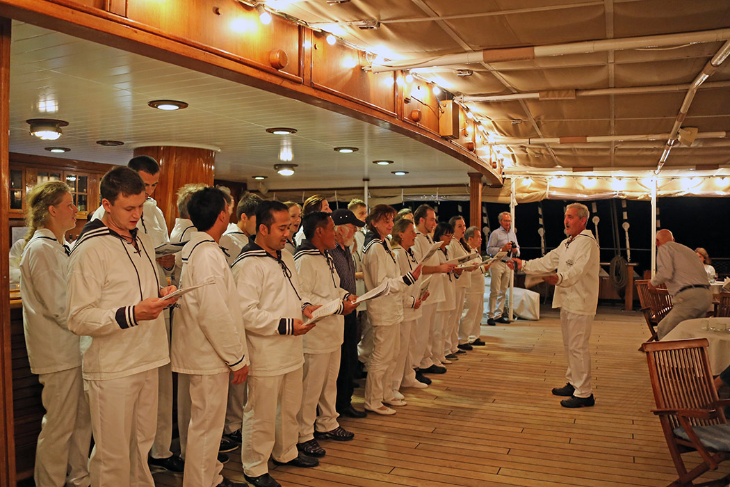 Der Kapitän gibt einen Ausblick über Routenverlauf und Wetter, Lektor und Cruise Director Einblicke in Programm und Ausflüge. Wer möchte, stellt seine Tauglichkeit für das eigene Aufentern bis zur ersten Plattform unter Beweis.