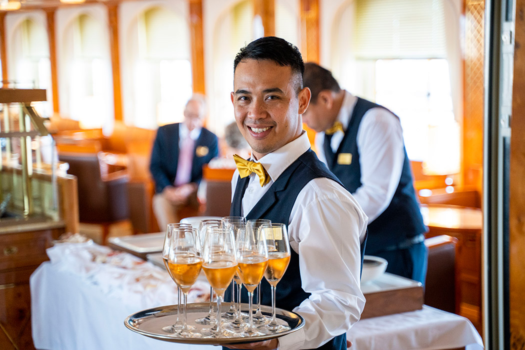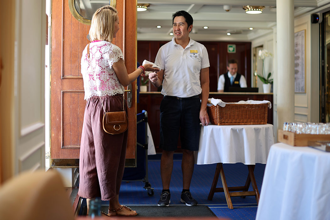 Die Crew empfängt Sie mit Champagner und Erfrischungstuch, bevor Sie Ihre Kabine beziehen.