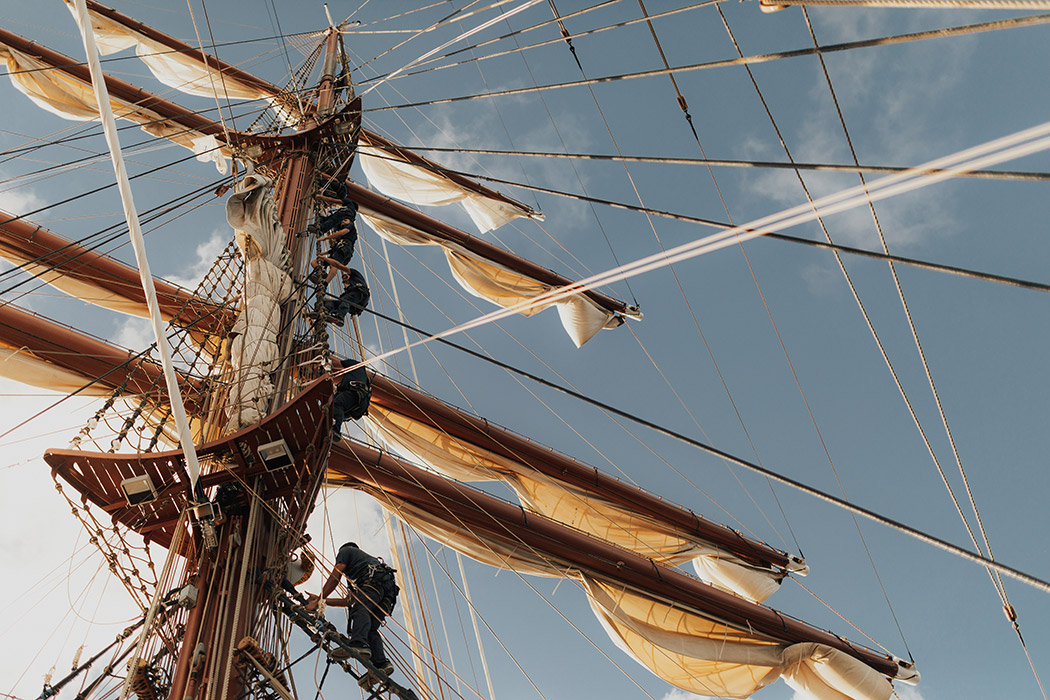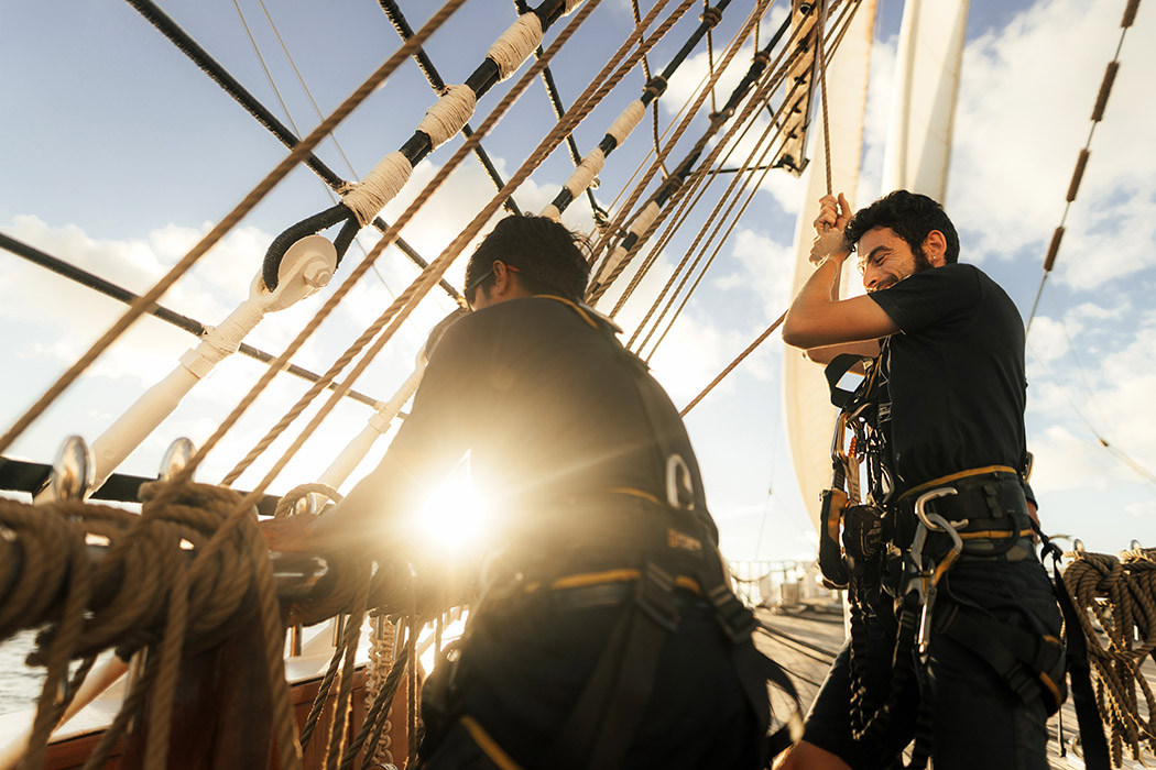 Mit einem Kaffee zum Sonnenaufgang an Deck tauchen Sie ein in das Leben an Bord: Die Crew setzt erstmals die Segel – und dies traditionell von Hand. Während die Matrosen in die Wanten klettern und die Leinen spannen, lauschen Sie gespannt den Erklärungen des Ersten Offiziers. Bis alle Segel den Wind einfangen, vergeht fast eine volle Stunde.