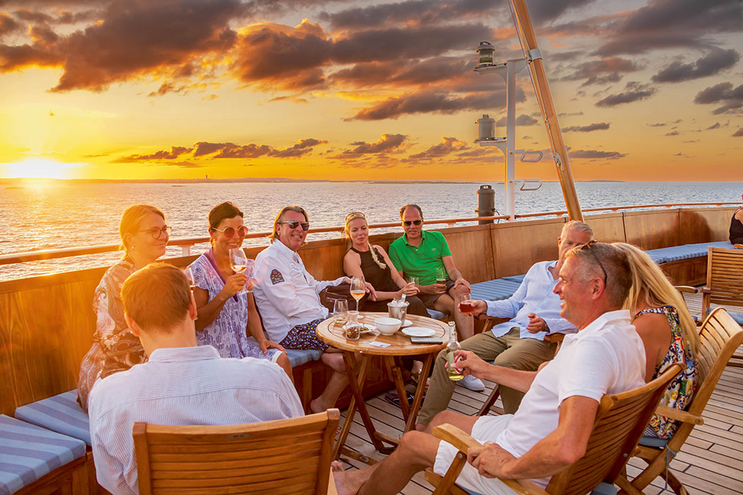Nach ersten Formalitäten wie der Seenotrettungsübung erleben Sie beim Dinner an Deck und dem ersten Auslaufen auf See die besondere Stimmung eines Reisebeginns an Bord der SEA CLOUDs.