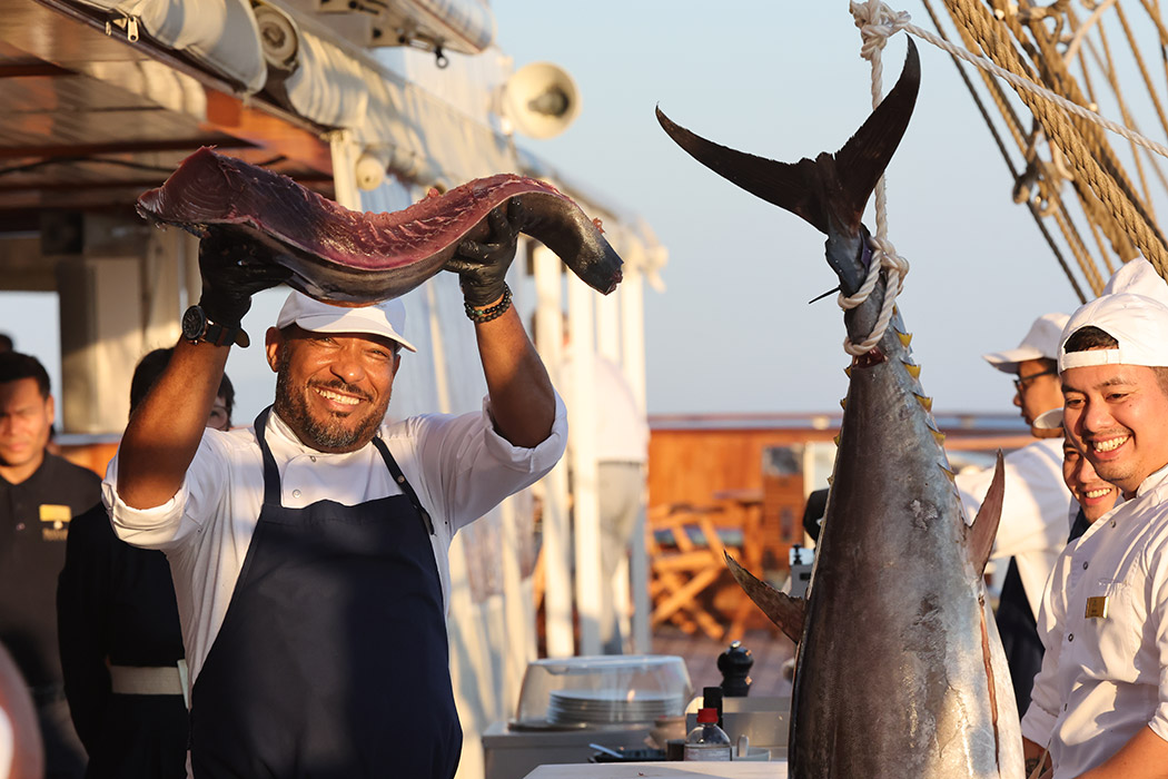 Wenn der Kapitän den Anker vor dem idyllischen Bitter End Yacht Club wirft, bereitet die Crew mit dem „Big Fish“ ein besonderes Abendessen unter freiem Himmel vor – und lädt im Anschluss zu Shantys in Feierlaune.