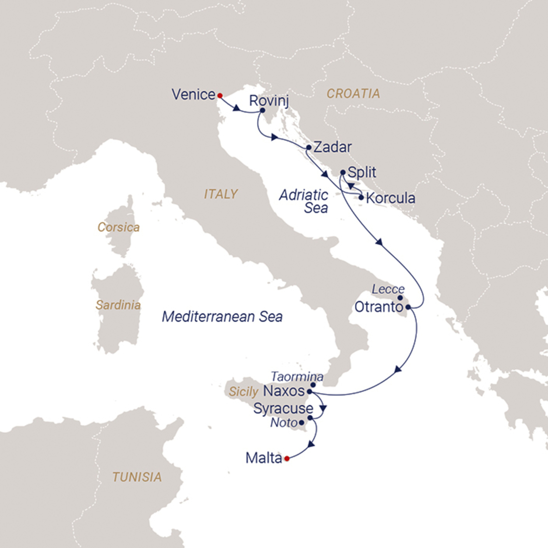 Cultural heritage and sunny scenery along the coasts of Croatia and Sicily